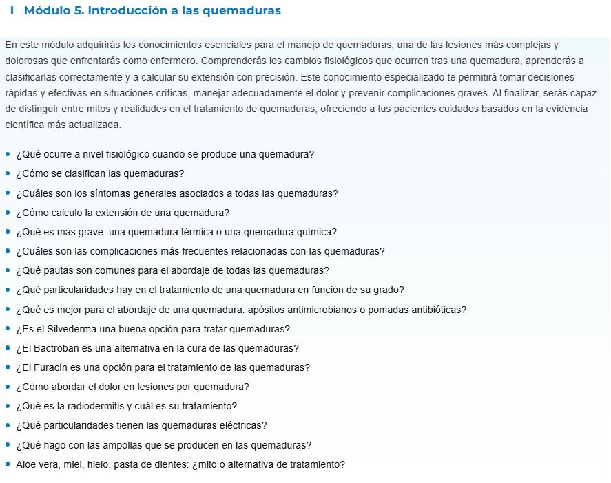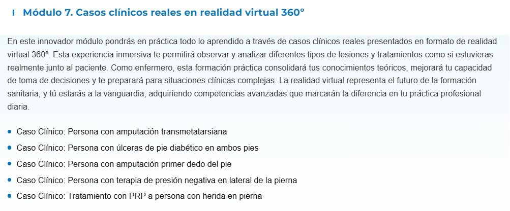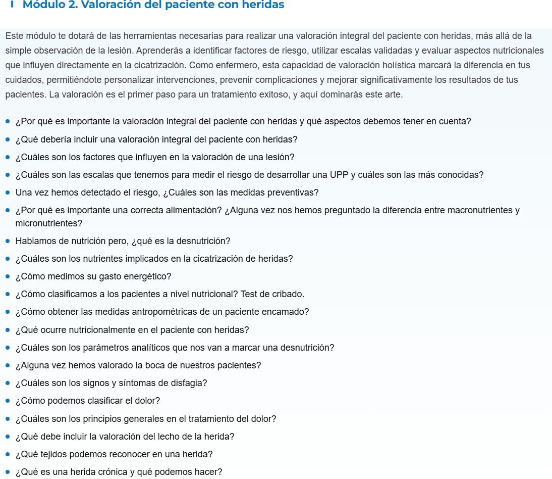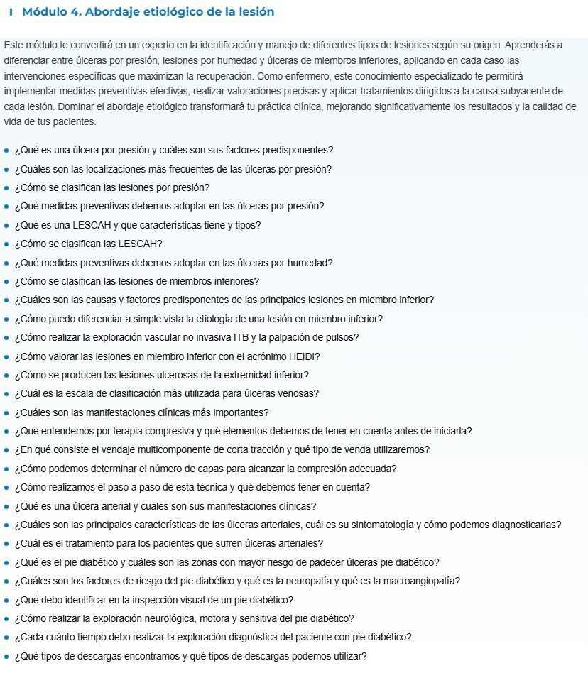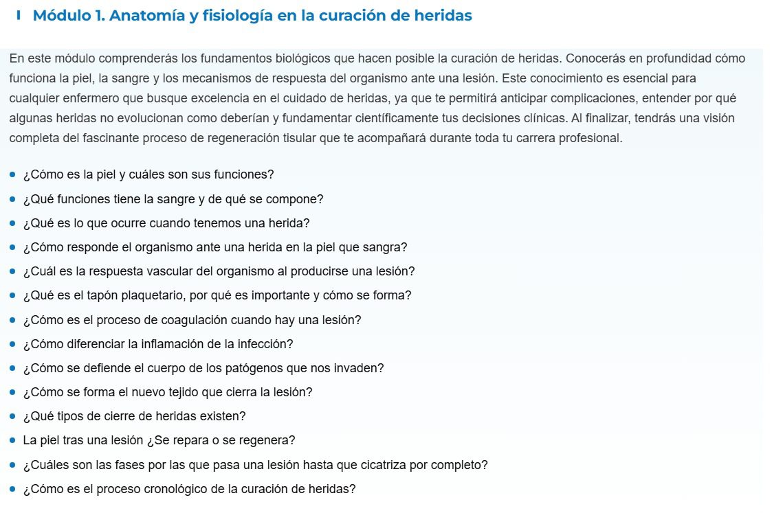 • A través de casos reales y situaciones clínicas, conocerás la importancia de tener conocimientos especializados en la curación de heridas para evitar consecuencias graves para los pacientes.